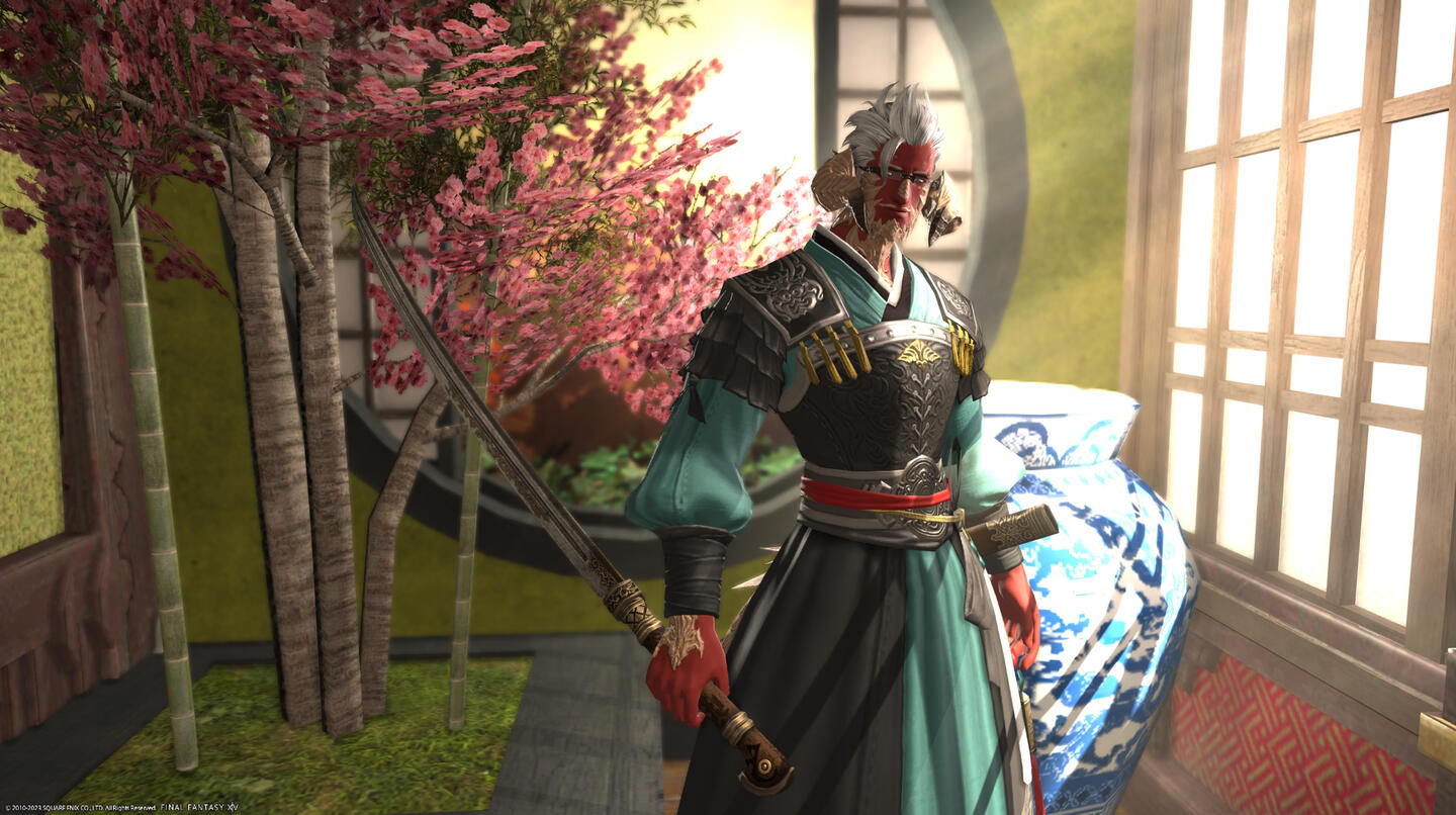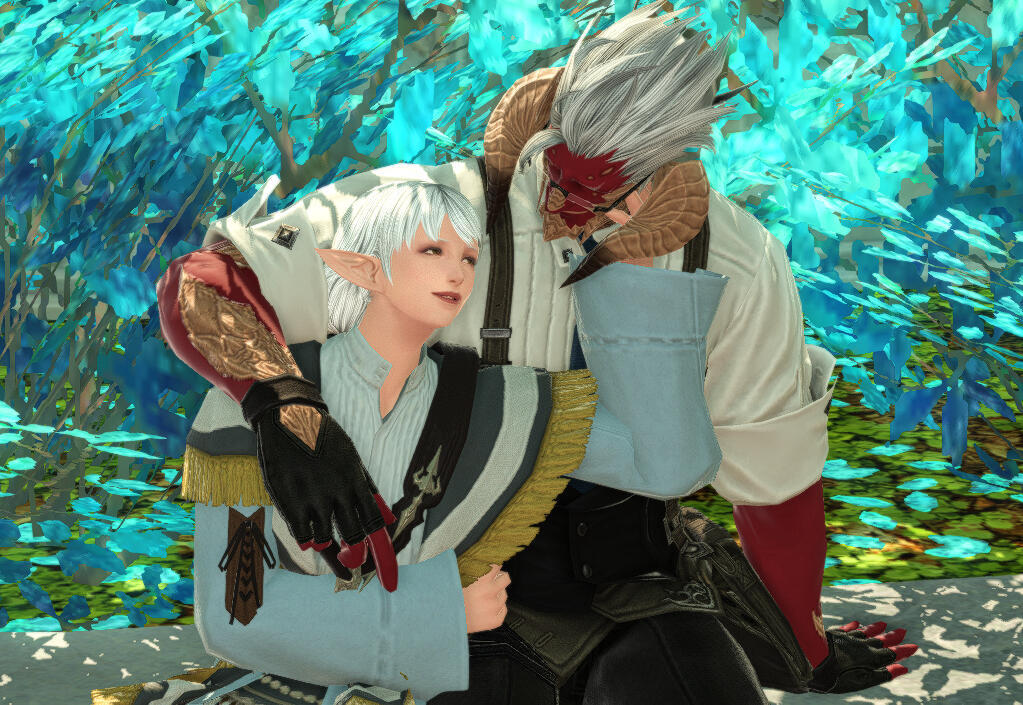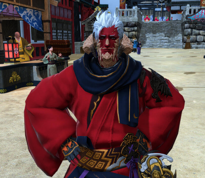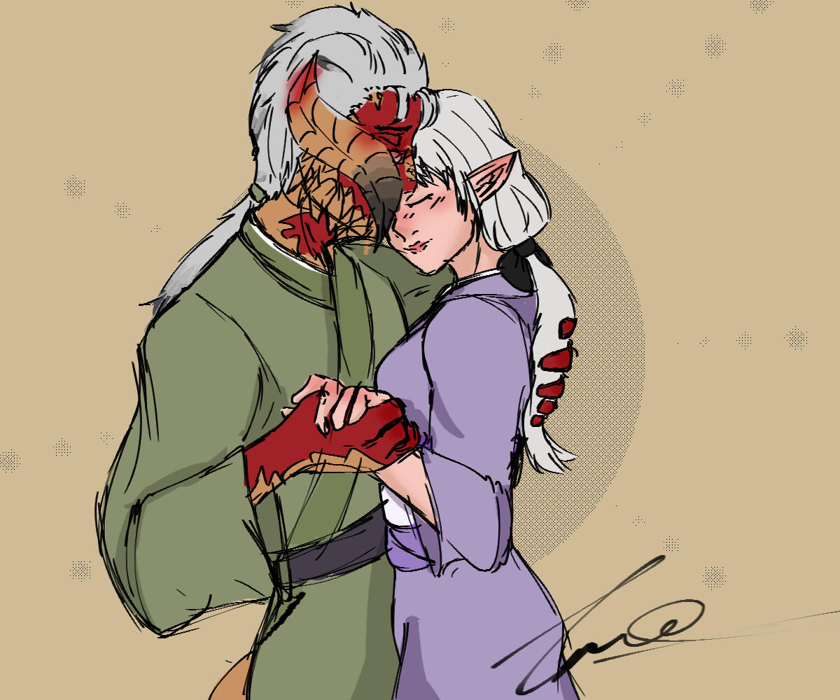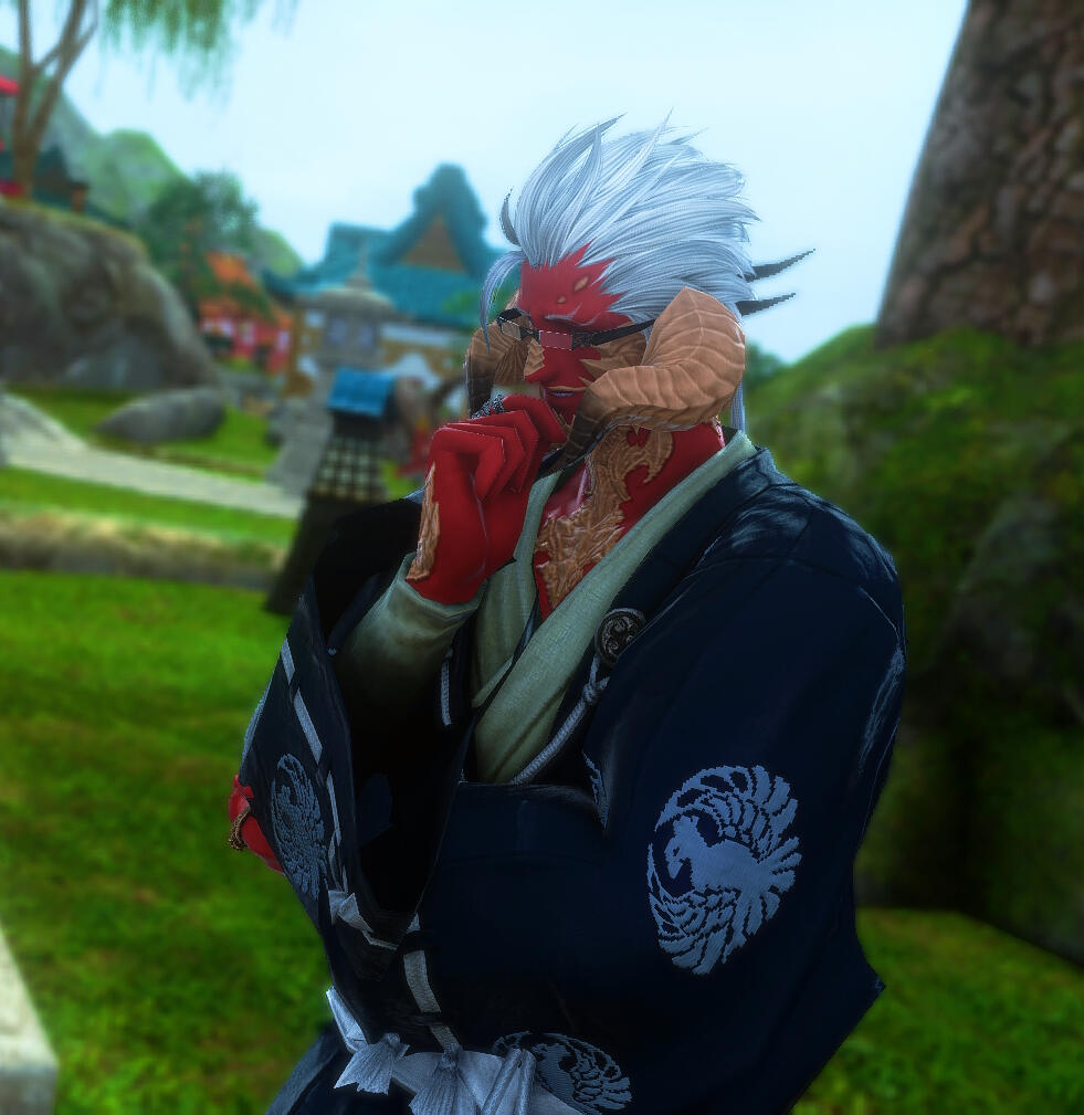 He was so blindly proud of his son that he didn't notice young Akitsu's struggling with keeping up with the family's expectations...On that same year, that is 25 years prior to ARR, the Garlean Empire invaded Doma. Akitsu was called to fight for his lord, while Kuwagata and Hotarubi stayed to protect their village from the imperials.The only thing that returned to them was Akitsu’s katana broken in half…Kuwagata completely broke down, his son’s death drowned him in guilt. He blamed himself for pushing his son into becoming a samurai, for placing such a hard duty on his young shoulders...He even considered taking his own life to go with his son, but…he couldn’t. Committing seppuku would have only dishonored his son’s memory. He had nothing to be punished for, on the contrary, he as a father should have been proud of it, as it was the most honorable death a samurai could have had. But he couldn't accept that. Visions of an injured Akitsu, captured by the imperials, tormented him day and night (he didn't know that it was the Echo).Hotarubi although, she was sure that Kuwagata's visions were the will of the kami guiding them, telling them that their son was still alive. Staying in Doma would only end up with both dead or worse, so she took his grieving husband with her and fled to Hingashi. Settled near Kugane, Hotarubi took any job she could to provide for her family and helping any Doman refugees while looking for info about Akitsu. Over time, Kuwagata got some of his spirit back to take care of the house and work and his aging wife, although the grief for his son never left him.Years passed, and Hotarubi grew old and fragile. In her last moments, she made Kuwagata promise to her that he would go find their son. That she was sure Akitsu was alive somewhere, and Kuwagata shouldn’t live the rest of his life in regret. She made him promise her that he would live, for her and for their son. Kuwagata promised he would honor her wish.After the proper mourning period, Kuwagata found out that some Doman refugees had fled to Eorzea, so he decided to travel there.The rest of it it's just Kuwagata coincidentally being in the right place at the right moment. He didn't have any interest in politics, so he just followed Alphinaud around while he was looking for info on his son. He asked around in every city he had been, but no hints of him...although he had always known his son was gone. But he did it anyway, because he promised his wife.